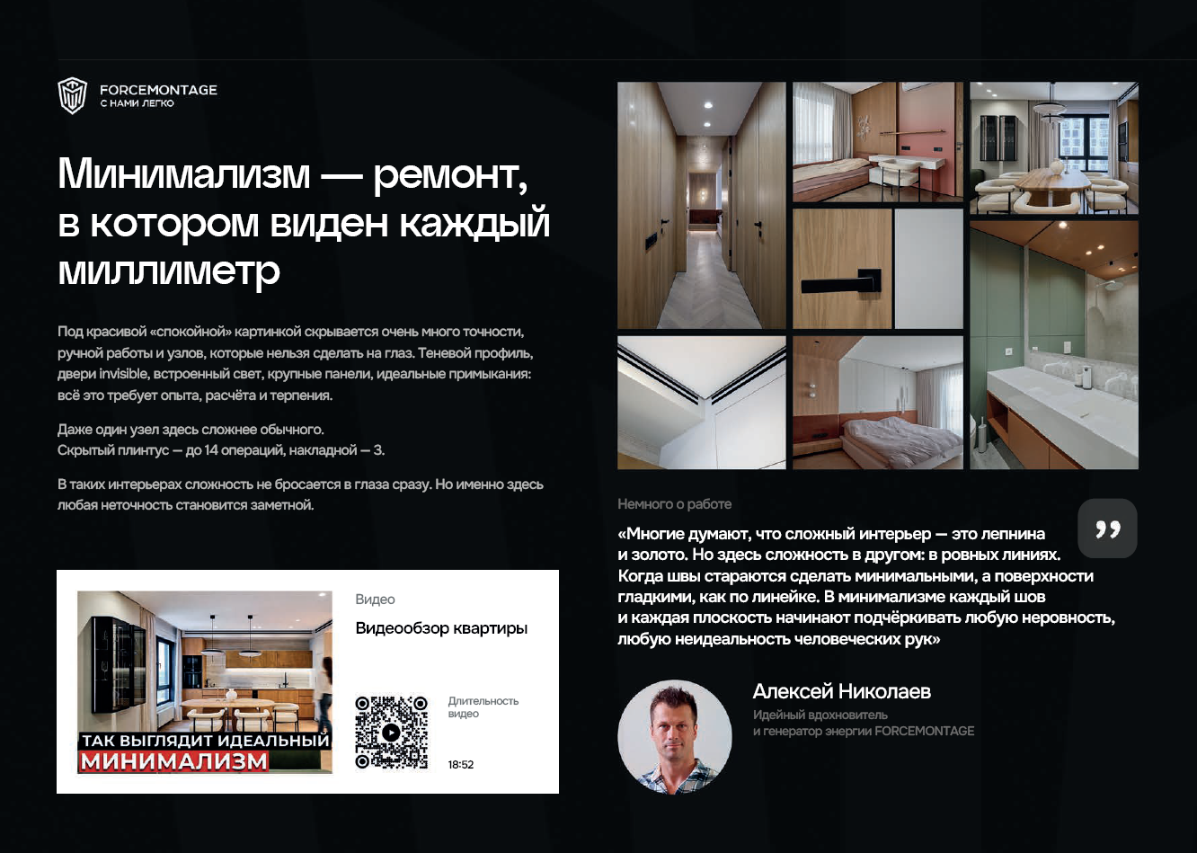 Минимализм — это ремонт, в котором виден каждый миллиметр. Под спокойной визуальной картинкой скрывается много точности, ручной работы и узлов, которые нельзя сделать на глаз. Теневой профиль, двери invisible, встроенный свет, крупные панели, идеальные примыкания — всё это требует опыта, расчёта и терпения. В таких интерьерах любая неточность становится заметной сразу.
