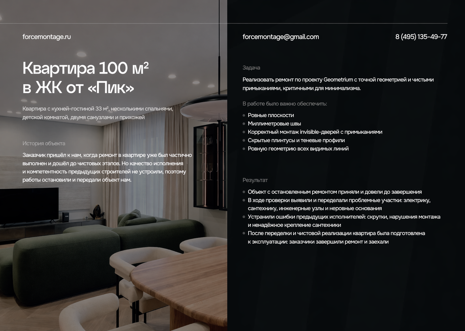 Эта квартира площадью 100 м² в ЖК от ПИК — пример ремонта, который пришлось не начинать с нуля, а фактически спасать на этапе, когда предыдущие исполнители уже допустили ошибки. Заказчик передал объект Forcemontage после частично выполненных работ, потому что качество исполнения не устроило. В итоге квартиру не просто довели до завершения, а заново выстроили логику точной реализации проекта Geometrium: с ровными плоскостями, аккуратными примыканиями, скрытыми плинтусами, теневыми профилями и корректным монтажом invisible-дверей. Такой подход особенно важен для минималистичных интерьеров, где любая неровность сразу становится заметной.