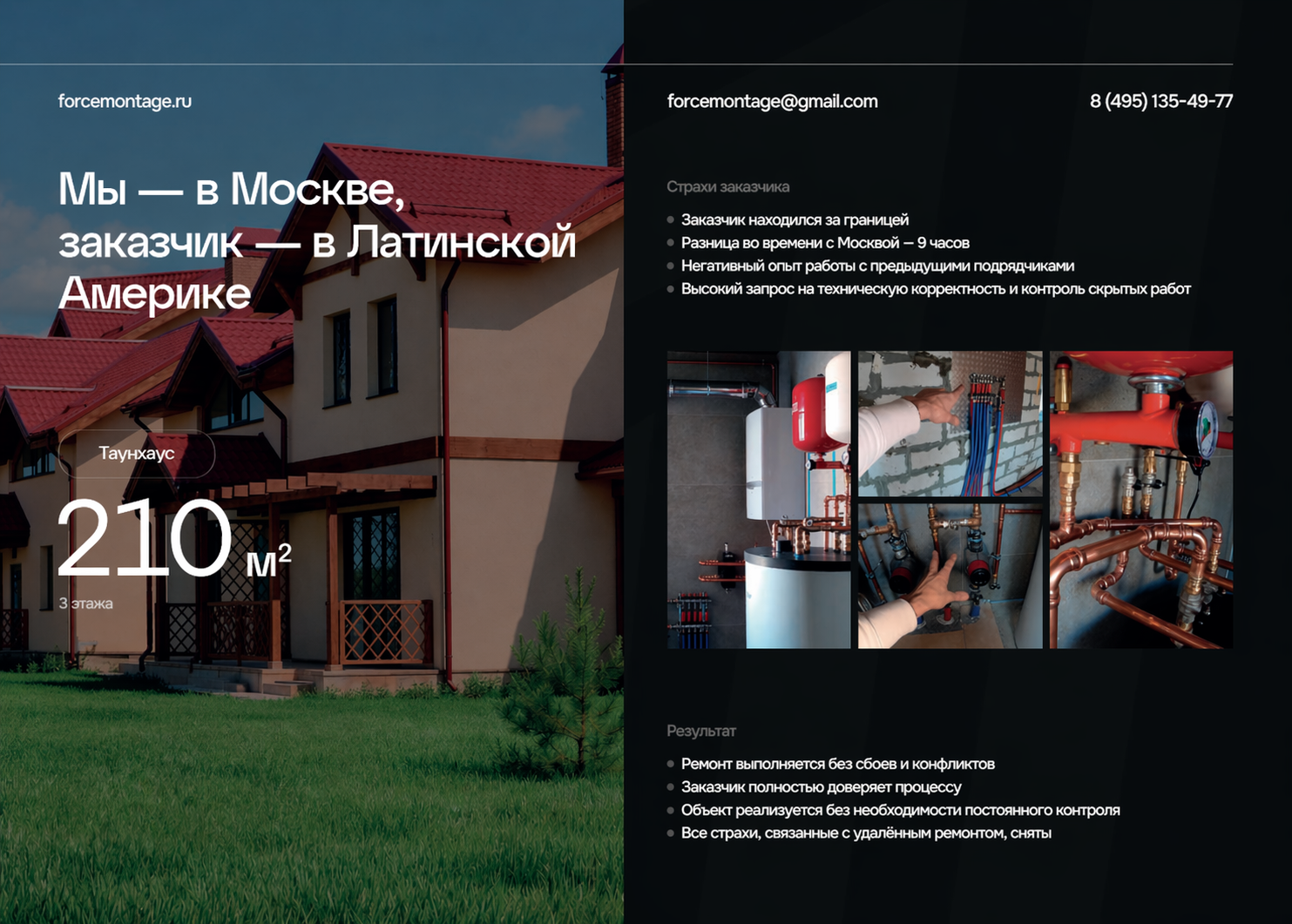 Этот проект показывает, как может быть организован удалённый ремонт таунхауса, когда объект находится в Москве, а заказчик — в Латинской Америке. В работе было важно снять основные страхи заказчика: разницу во времени, негативный опыт с предыдущими подрядчиками, высокий запрос на техническую корректность и контроль скрытых работ.