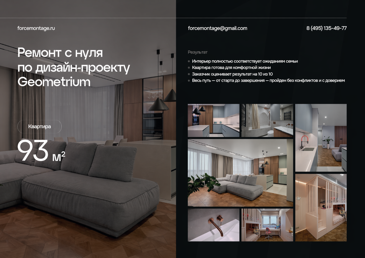 Эта квартира площадью 93 м² выполнена с нуля по дизайн-проекту Geometrium. В интерьере сделан акцент на спокойную семейную атмосферу: светлые стены, мягкие текстуры, теплое дерево, лаконичная кухня, продуманное освещение и цельное пространство без визуального шума. По фотографиям видно, что ремонт ориентирован не только на эстетику, но и на ежедневный комфорт: удобная гостиная, аккуратные санузлы, функциональная кухня и детская, где всё организовано для жизни семьи.